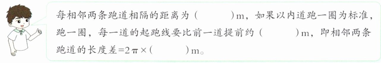 (1) 某小学操场上的跑道最内圈长 400m,每条跑道宽 1.5m,那么进行 800m 跑步比赛时,相邻的两条跑道起跑线应间隔(