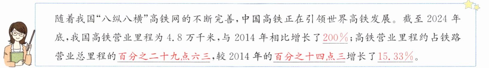 随着我国“八纵八横”高铁网的不断完善,中国高铁正在引领世界高铁发展。截至 2024 年底,我国高铁营业里程为 4.8 万千米,与 2014 年相比增长了 $ 200\% $;高铁营业里程约占铁路营业总里程的百分之二十九点六三,较 2014 年的百分之十四点三增长了 $ 15.33\% $。