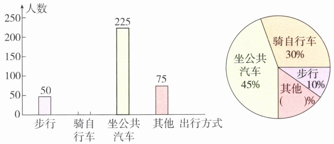 (2)“骑自行车”的人数占学生总人数的30%,即500 × 30% = 150(人);求“其他”出行方式的人数占学生总人数的百分之多少,列式为1 - 45% - 30% - 10% = 15%。
