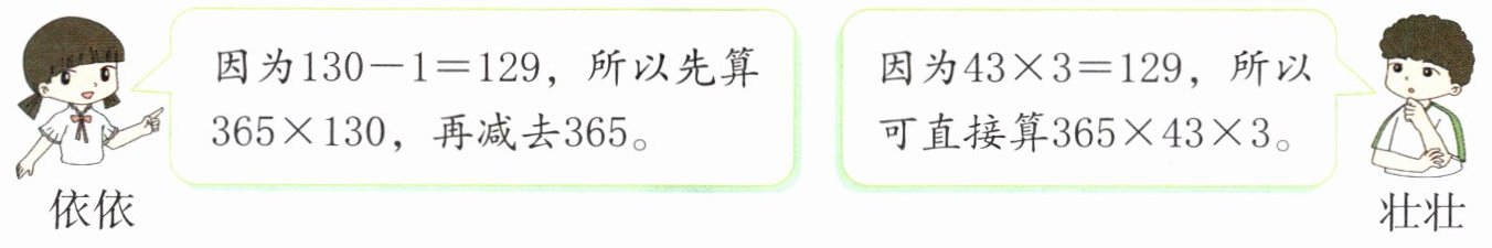 解析:365×129=365×(130-1)=365×130-365×1,所以依依的方法是对的;365×129=365×(43×3)=365×43×3,所以壮壮的方法也是对的。还可以按365×133-365×4或365×111+365×18等方法解决。解决本题的关键就是将129进行变化,只要新的算式里面的数字不出现2和9就行。
