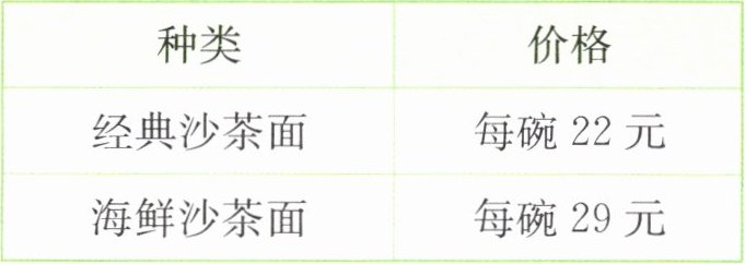 解析:本题采用列举法解决问题,他们有80元,想要买3碗沙茶面,题中有单价分别为22元和29元的沙茶面可供他们选择,只要买的3碗沙茶面的总价不超过80元即可。因为22<29,可以从买3碗22元的经典沙茶面开始考虑,单价22元的经典沙茶面的数量依次减1,单价29元的海鲜沙茶面的数量依次加1,直到价格超过80元为止。