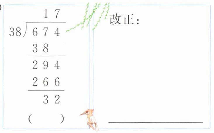 $ \begin{array}{r} 17 \\ 38 \enclose{longdiv}{674} \\ 38 \\ \hline 294 \\ 266 \\ \hline 32 \end{array} $
