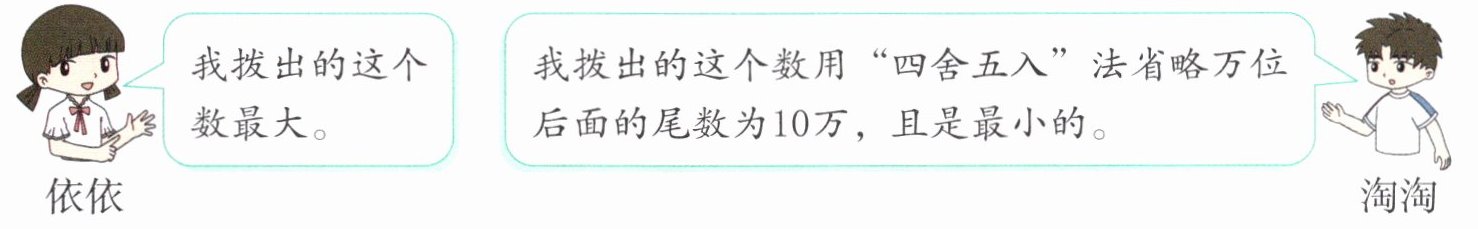淘淘:我拨出的这个数用“四舍五入”法省略万位后面的尾数为$10$万,且是最小的。
