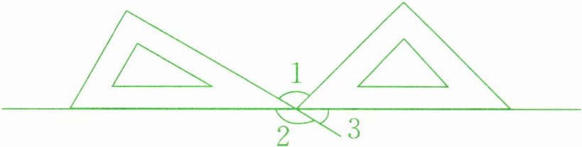 下图中,沿着一条直线摆出了一副三角板。求 $\angle 1$,$\angle 2$ 和 $\angle 3$ 的度数。