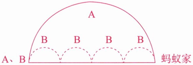 2. A、B 两只蚂蚁分别按图中的两条路线回家(A 走的是实线,B 走的是虚线),如果它们的速度相同,哪只蚂蚁先到家?为什么?