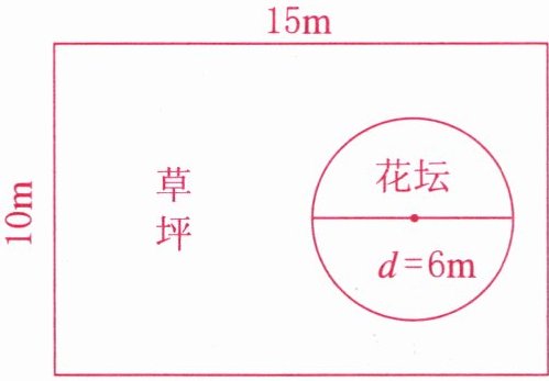 草坪的面积 $= 长方形的面积 - 圆形花坛的面积 = 150 - 28.26 = 121.74$(平方米)。