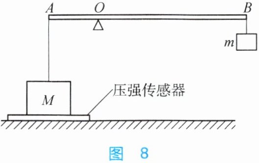 9. 如图8所示,水平地面上放置着一个压强传感器 $ K $,该压强传感器上再放有质量 $ m = 9kg $、棱长为 $ 20cm $ 的实心立方体,通过不可伸长的细绳将立方体悬挂在杠杆 $ AB $ 的左端,杠杆可绕支点 $ O $ 转动, $ l_{AO} : l_{OB} = 1:3 $;在杠杆的右端挂上质量为 $ m = 1kg $ 的物体,杠杆处于水平位置平衡,这时细绳对杠杆左端 $ A $ 点的拉力为______ $ N $;沿竖直方向切去 $ M $ 质量的 $ 0.7 $ 倍(使 $ M $ 的重心位置不变),并将右端物体 $ m $ 悬挂在 $ OB $ 的中点,则此时压强传感器示数为______ $ Pa $。