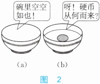 4. 小凯学习完光现象相关内容之后,兴致勃勃地回家给妹妹表演了一个小魔术。他先让妹妹站定,在她面前摆一只“空碗”,如图2(a)所示,然后缓慢地往碗里倒水,成功地给妹妹“变”出了一枚硬币,如图2(b)所示。该魔术的成功是利用了(