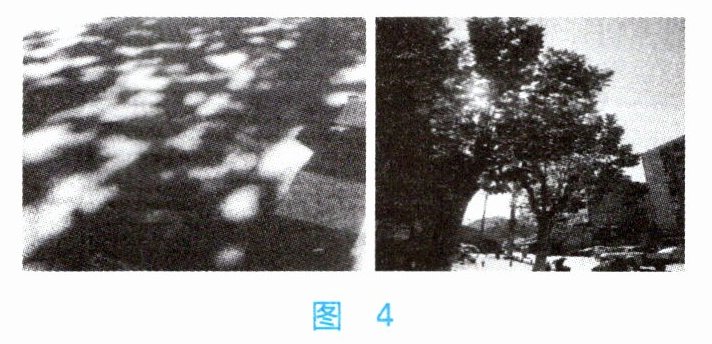 8. 在一个烈日炎炎的午后,陈老师走在随州街头,看到地面上树荫里有许多圆形光斑,抬头看看树叶间刺眼的阳光,想到这树荫下藏着物理学的秘密,便拍下两张照片,如图4所示。经估测树荫下一个清晰光斑的直径约为7cm,这束阳光从约7m高处的树叶间照射下来。我们常说太阳光经过约8min来到地球(太阳和地球之间的距离按$1.5×10^1^1m$计算),粗略计算太阳的直径最接近(