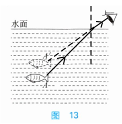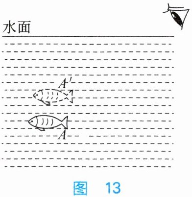 19. 小聪同学在鱼池边欣赏鱼儿在水中游来游去,常言道“眼见为实”,在这里却是“眼见为虚”。设真实的鱼尾上有一点A,在小聪眼里这一点“跑到了A'的位置”,如图13所示。请画出造成这种现象的光路图(只需用一条光线的光路示意即可,并保留作图痕迹)。