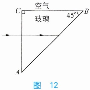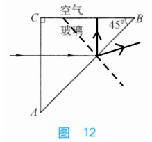 18. 如图12所示,一条光线垂直界面AC进入玻璃砖后,在界面AB上只发生反射,在图中画出该光线经界面AB反射和从界面BC离开玻璃砖后的光线。