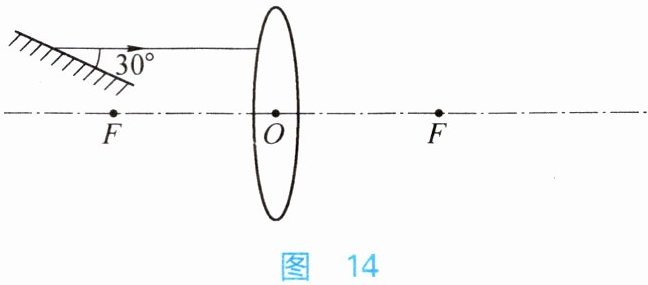 20. 图14中的光线经过平面镜反射后水平射向竖直放置的凸透镜,请画出平面镜的入射光线和凸透镜的折射光线。