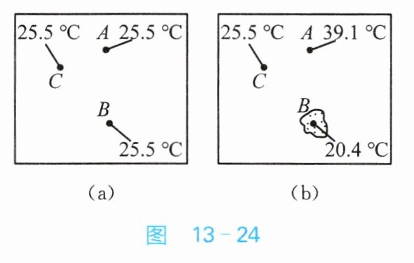 8. 小明用红外成像测温仪拍摄桌面,拍摄到的画面显示在桌面的 A、B、C 位置上的温度如图 13 - 24(a)所示。接着,他用手快速摩擦其中一个位置,在另一个位置喷上温度为 25.5℃的酒精,再用红外成像测温仪拍摄桌面,拍摄到的画面如图 13 - 24(b)所示。