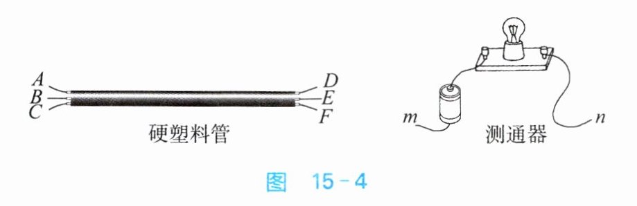 6. 如图15-4所示,在一根横跨河流两岸的硬塑料管内穿有三根完全相同的电缆线。为了辨别哪两个线头属于同一根导线,可以用图示的测通器来测试,其操作过程如下: