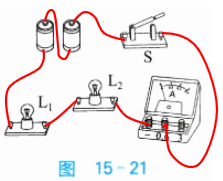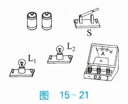 9. 在图 15 - 21 中连接电路,要求:开关 $ S $ 是总开关,两灯泡串联,电流表测通过灯 $ L_{1} $ 的电流。