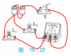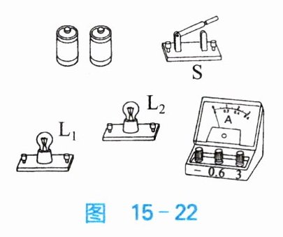 10. 在图 15 - 22 中连接电路,要求:两灯泡并联,开关 $ S $ 是总开关,电流表测通过 $ L_{1} $、$ L_{2} $ 的总电流。