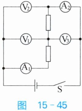 5. 如图 15 - 45 所示的电路中,当开关 $ S $ 闭合时,电压表 $ V_1 $、$ V_2 $、$ V_3 $ 的示数分别为 $ U_1 $、$ U_2 $、$ U_3 $,电流表 $ A_1 $、$ A_2 $ 的示数分别为 $ I_1 $、$ I_2 $(五只电表的示数均不为零),那么下列关系式正确的是(