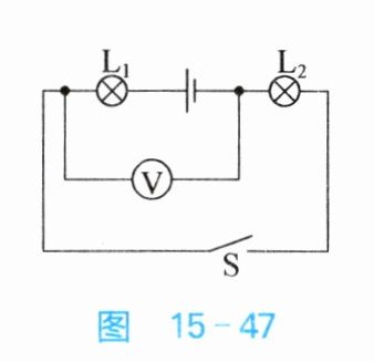 7. 如图 15 - 47 所示,电源电压是 $ 3 \, V $,$ S $ 闭合后电压表的示数为 $ 1 \, V $,则灯 $ L_2 $ 两端的电压为