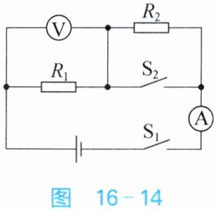 4. 如图 16 - 14 所示,电源电压保持不变,闭合开关 $ S_{1} $、$ S_{2} $,电压表的示数为 $ 6 \, V $,电流表的示数为 $ 0.6 \, A $;断开 $ S_{2} $ 后,电压表的示数变为 $ 2 \, V $。$ R_{2} $ 的电阻和电源电压分别是(