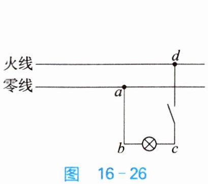 8. 小阳闭合开关后,发现电灯不亮,他用测电笔测试图 16 - 26 中的 $ a $、$ b $、$ c $、$ d $ 四点,只有 $ d $ 点发光,那么可能发生的故障是(