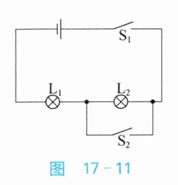 9. 如图 17 - 11 所示的电路中,电源电压恒定。$L_1、$$L_2 $均标有“6 V 6 W”字样(设灯丝的电阻不变)。当$ S_1、$$S_2 $闭合时$,L_1 $正常发光,当$ S_1 $闭合$,S_2 $断开时,两灯的总功率是(