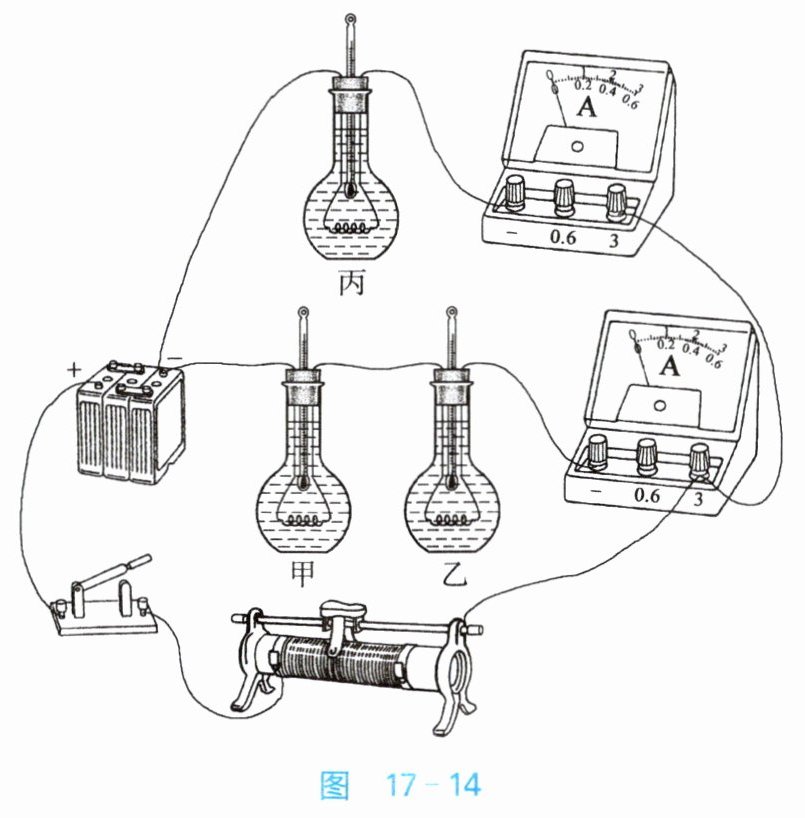 4. 为了探究电流通过导体产生的热量与什么因素有关,小明设计了如图 $ 17 - 14 $ 所示实验。三个完全相同的烧瓶中盛有等质量的煤油,已知电阻丝 $ R_{甲} > R_{乙} $,$ R_{乙} = R_{丙} $。