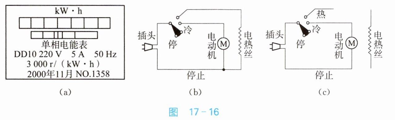 8. 小红家的理发用的电热吹风机的铭牌已模糊不清。为了测得它的额定功率,小红让家中所有用电器都停止工作,只将电吹风机接入 $ 220\mathrm{V} $ 的电路中让其正常工作,然后利用手表计时,同时观察家中电能表的运行情况[电能表的铭牌数据如图 $ 17 - 16(\mathrm{a}) $ 所示],发现 $ 10\mathrm{min} $ 电能表转盘转动了 $ 363 $ 圈。