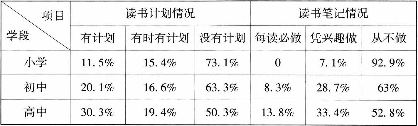 |学段|有计划|有时有计划|没有计划|每读必做|凭兴趣做|从不做|