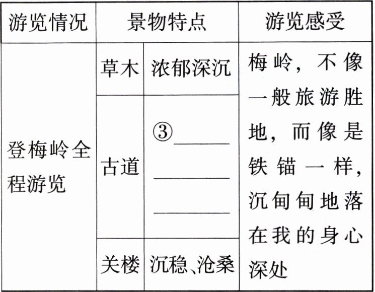 12. ①苍绿/苍苍 ②“八面来风山镇定”/“这是一部大书,不是一首小诗” ③斑驳、逶迤向上 13. ①中学时代读《梅岭三章》,作者对梅岭一往情深。②梅岭是英雄的象征,作者对梅岭无限崇敬和爱恋。 14. C 15. 示例一:“整容”一词运用拟人手法点出很多景点都有人工痕迹。示例二:把古道与翻修过的景点对比,突出古道的古迹古风。
