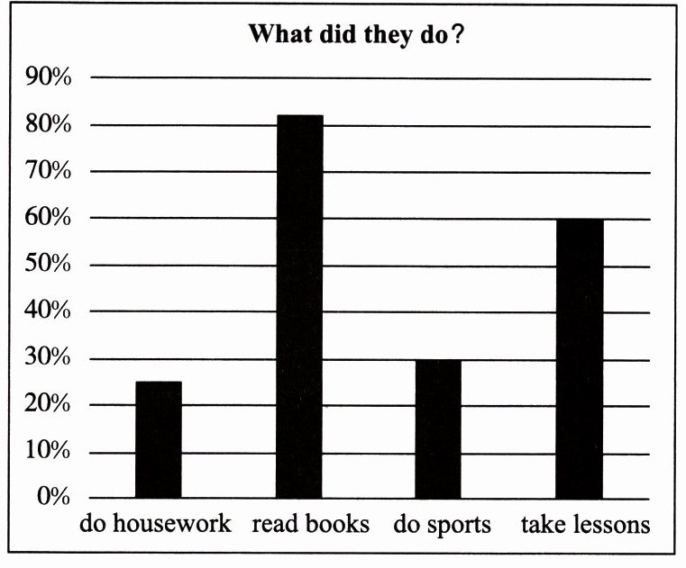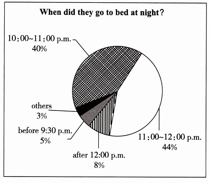 The following charts(表格) show some of their findings. Chart Ⅰ shows different bedtimes of students during holidays. Many junior high school students go to bed late during holidays. They may forget that enough sleep is important for their health and progress in learning. Chart Ⅱ shows that more than 80% of the students read during their holidays, and 60% take some other lessons. Reading and learning are an important part of holiday life, while doing housework and sports are not.