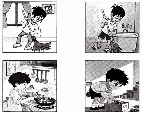 1. sweeps the floor 2. cleans the bathroom 3. cooking 4. sorts things