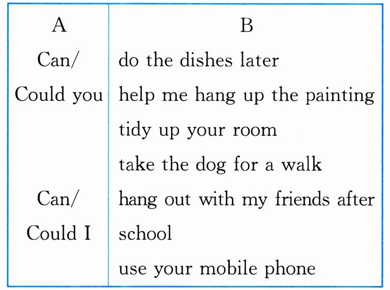 1. Could you help me hang up the painting 2. Could you tidy up your room 3. Could you take the dog for a walk 4. Could I do the dishes later 5. Could I hang out with my friends after school 6. Could I use your mobile phone