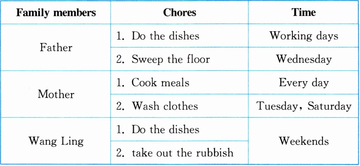 51. 假如你是王玲,下面是一张做家务的情况表。请根据所给的信息写一篇短文,谈谈你和家人所做的家务以及你对做家务的看法。