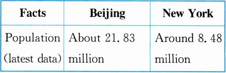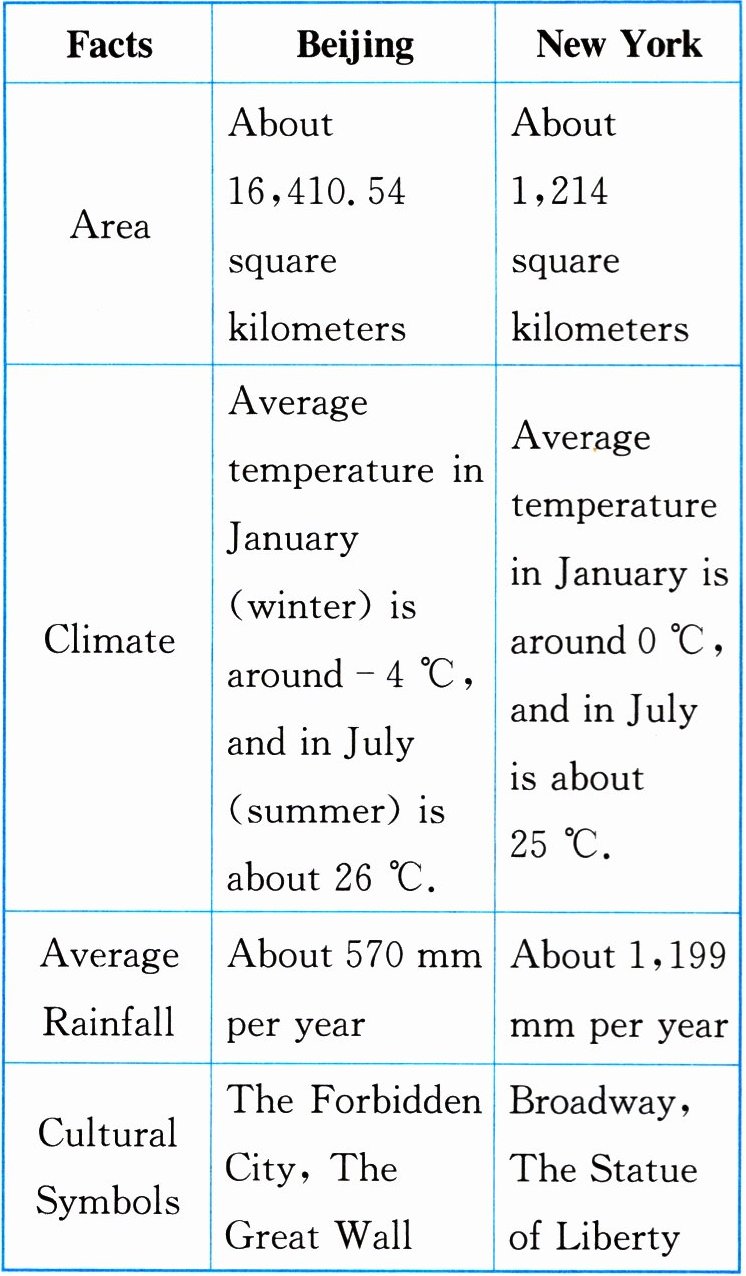 Ⅵ. 1. No, it doesn't. 2. Beijing(is much larger in area). 3. New York(has a higher average temperature in January). 4. New York has about 629 mm more rainfall than Beijing. 5. Beijing. 示例:Because it has the Forbidden City and the Great Wall. They have a long history.