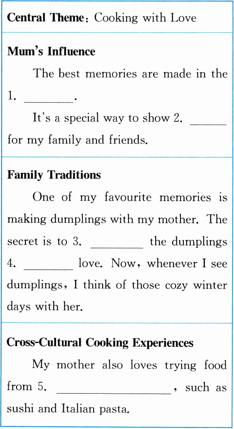 任务一:1. kitchen 2. care 3. fill 4. with 5. other countries 6. Boil 7. creating memories