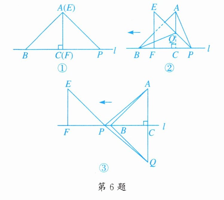 6. 如图①,将两块全等的三角板拼在一起,使△ABC 的边 BC 在直线 l 上,$AC \perp BC$,且$AC = BC$,△EFP 的边 FP 也在直线 l 上,边 EF 与边 AC 重合,$EF \perp FP$.