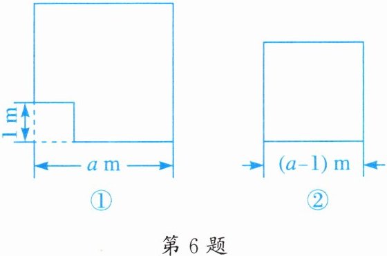 6. “丰收1号”小麦试验田是一块边长为$a\ m(a\gt1)的正方形田地去掉一块边长为1\ m$的正方形蓄水池后余下的部分,如图①所示;“丰收2号”小麦试验田是一块边长为$(a - 1)\ m$的正方形田地,如图②所示. 已知两块试验田的小麦产量都为$500\ kg$.