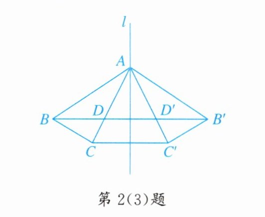 (3) 如图,点 $A$ 在直线 $l$ 上,$\triangle ABC$ 与 $\triangle AB'C'$ 关于直线 $l$ 对称,连接 $BB'$,分别交 $AC$,$AC'$ 于点 $D$,$D'$,连接 $CC'$. 下列结论中,正确的是