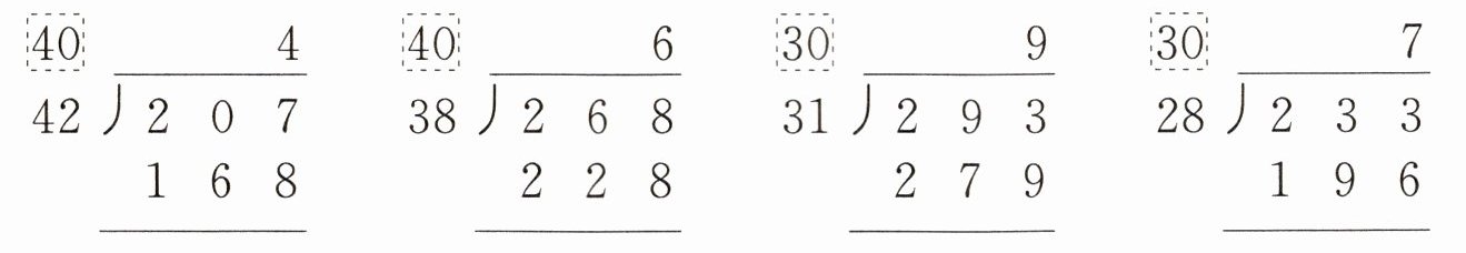 试商时把$42$看作$40$,商$4$,$42×4 = 168$,$207−168 = 39$,$39\lt42$,但$42×5=210\gt207$,所以准确的商是$4$。