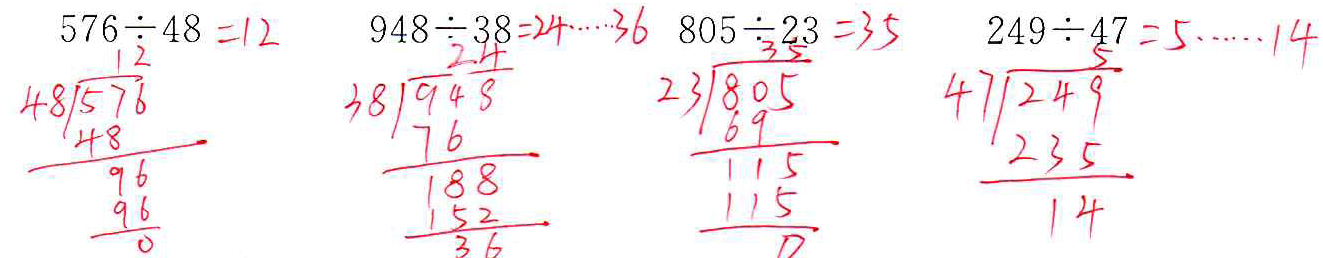 576÷48=12 948÷38=24······36 805÷23=35 249÷47=5······14