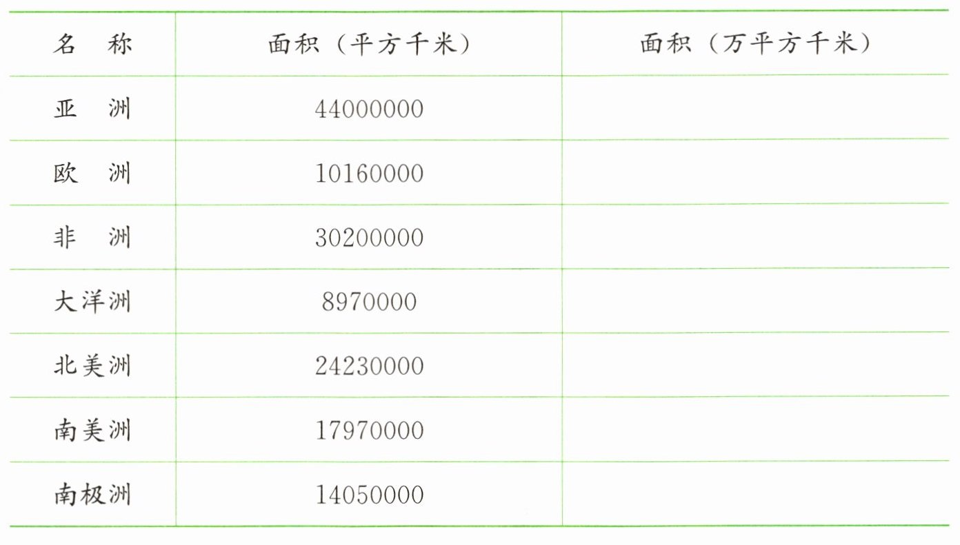 7. 把世界七大洲的面积改写成以“万平方千米”为单位的数。