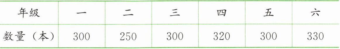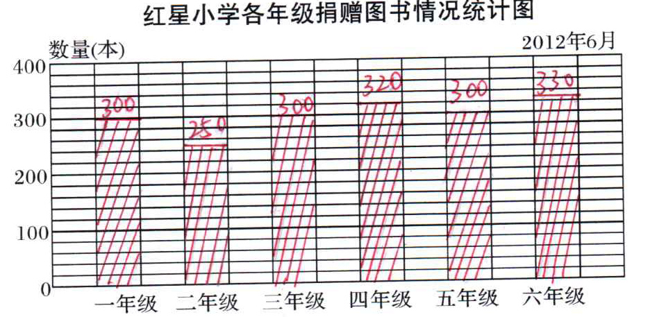 (2)总捐赠数:300 + 250 + 300 + 320 + 300 + 330 = 1800(本) 年级数:6个 平均每个年级捐赠:1800÷6 = 300(本)