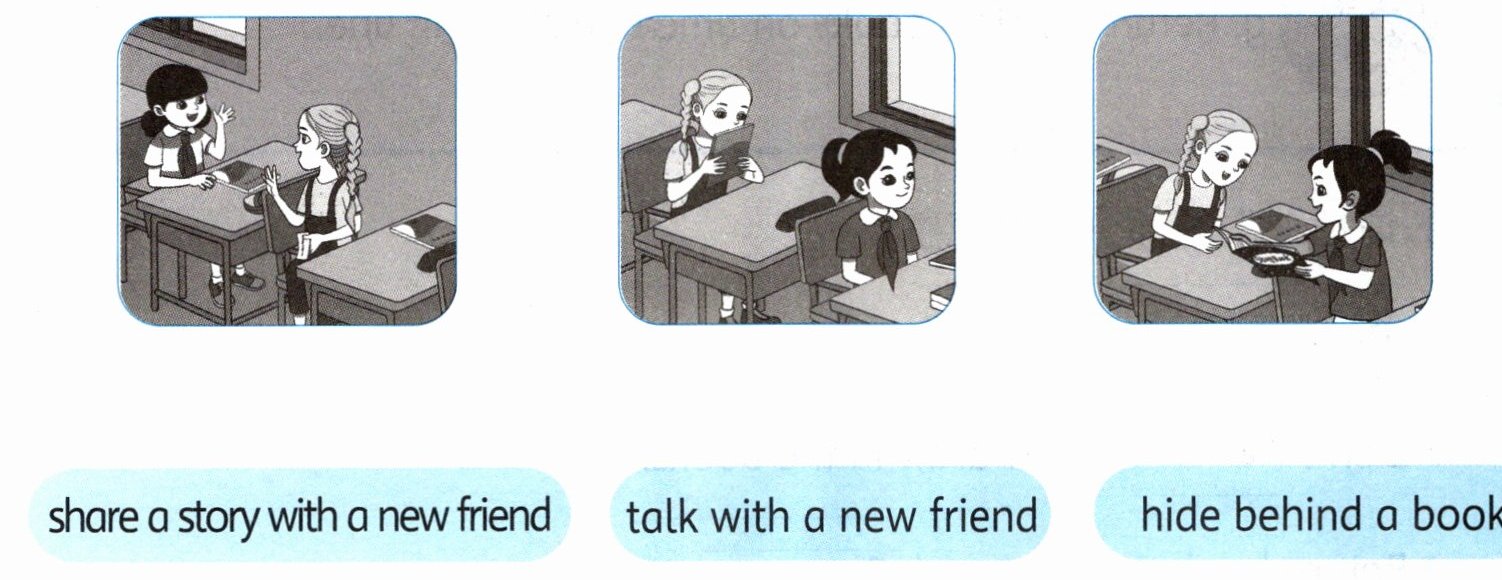 第一幅图连“talk with a new friend”;第二幅图连“hide behind a book”;第三幅图连“share a story with a new friend”。