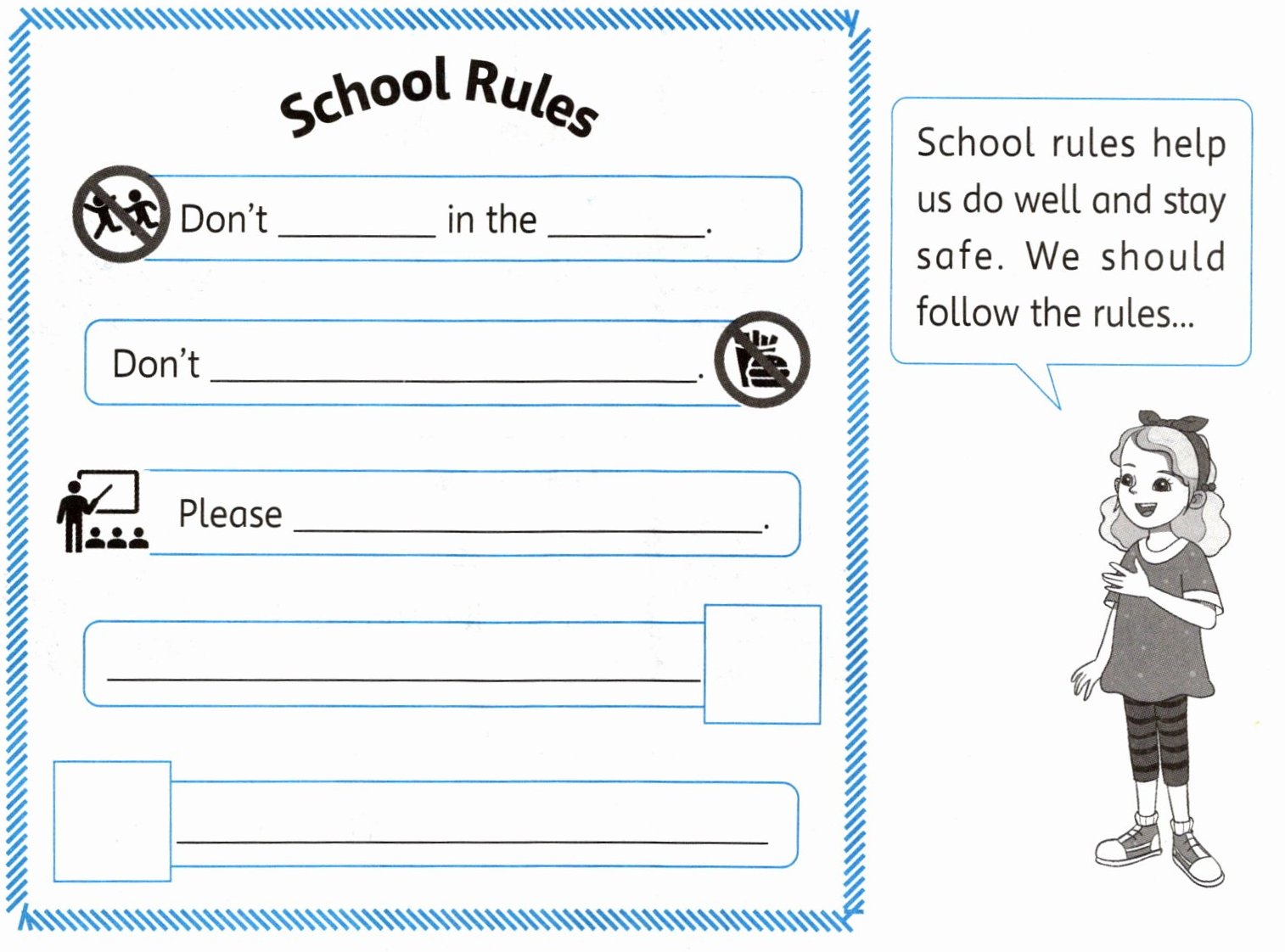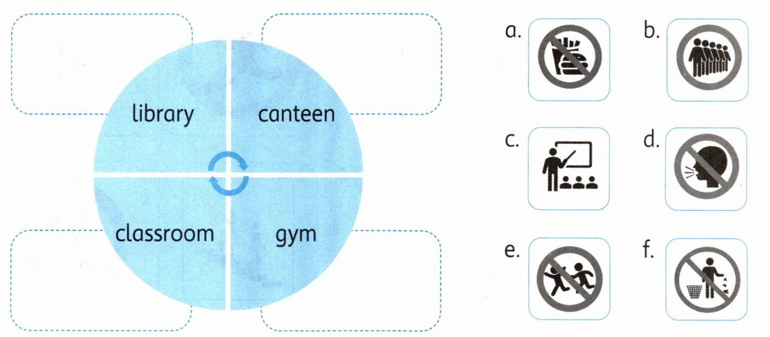 School rules help us do well and stay safe. In the library, we should be quiet. In the canteen, we shouldn't run or jump. We should wait in line. In the gym, we shouldn't litter. We shouldn't eat. In the classroom, we should listen to the teachers.