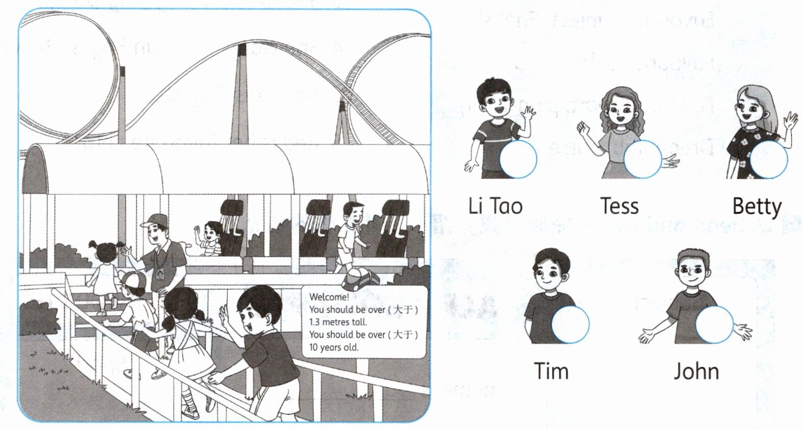 A. Listen and tick. 听录音,勾出可以乘坐过山车的小朋友。