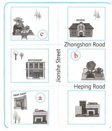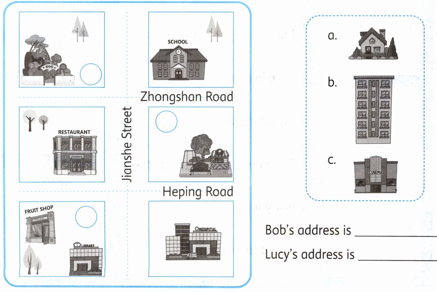 B. Listen, match and write. 听录音,将建筑匹配到地图中,然后写出人物的地址。