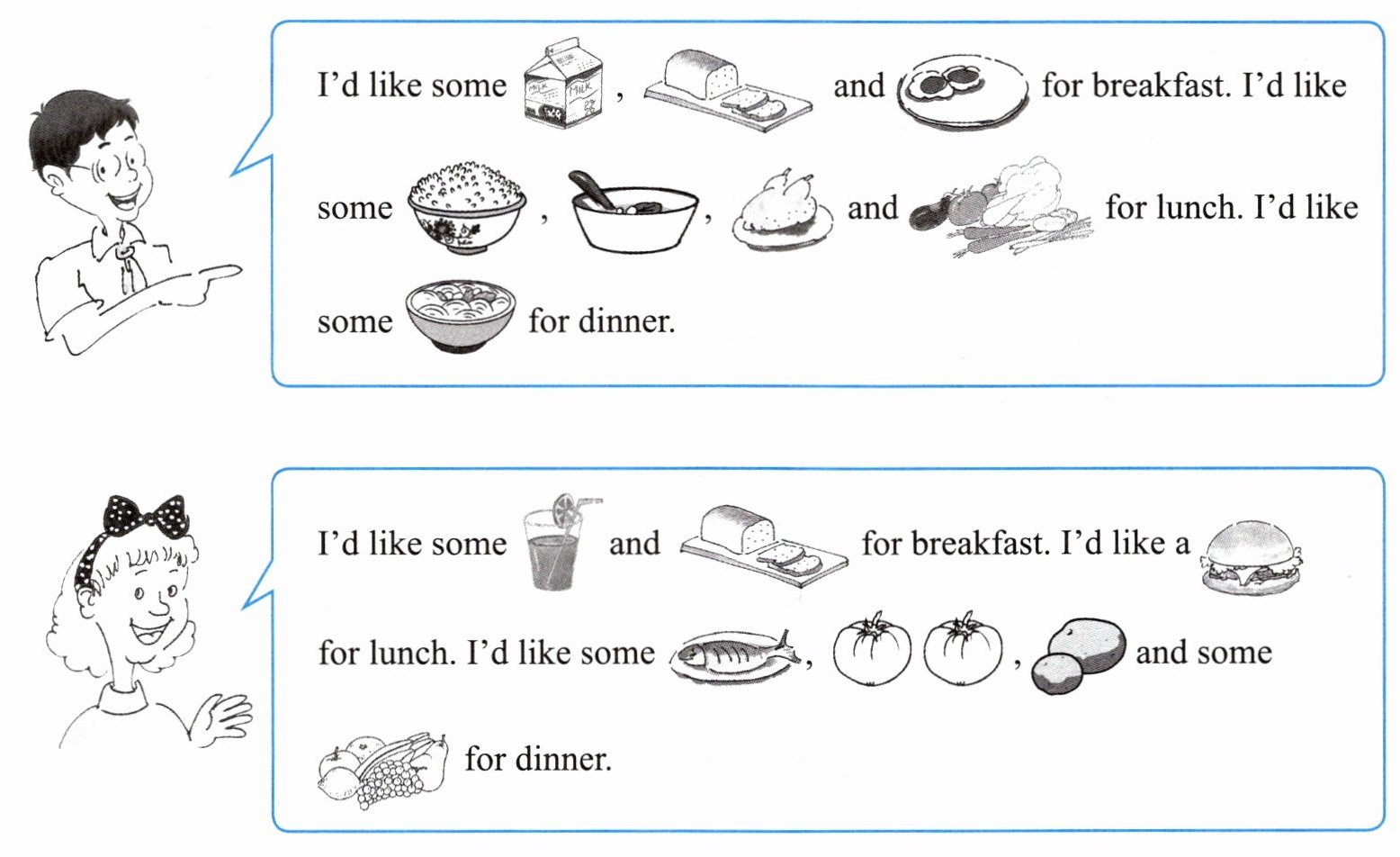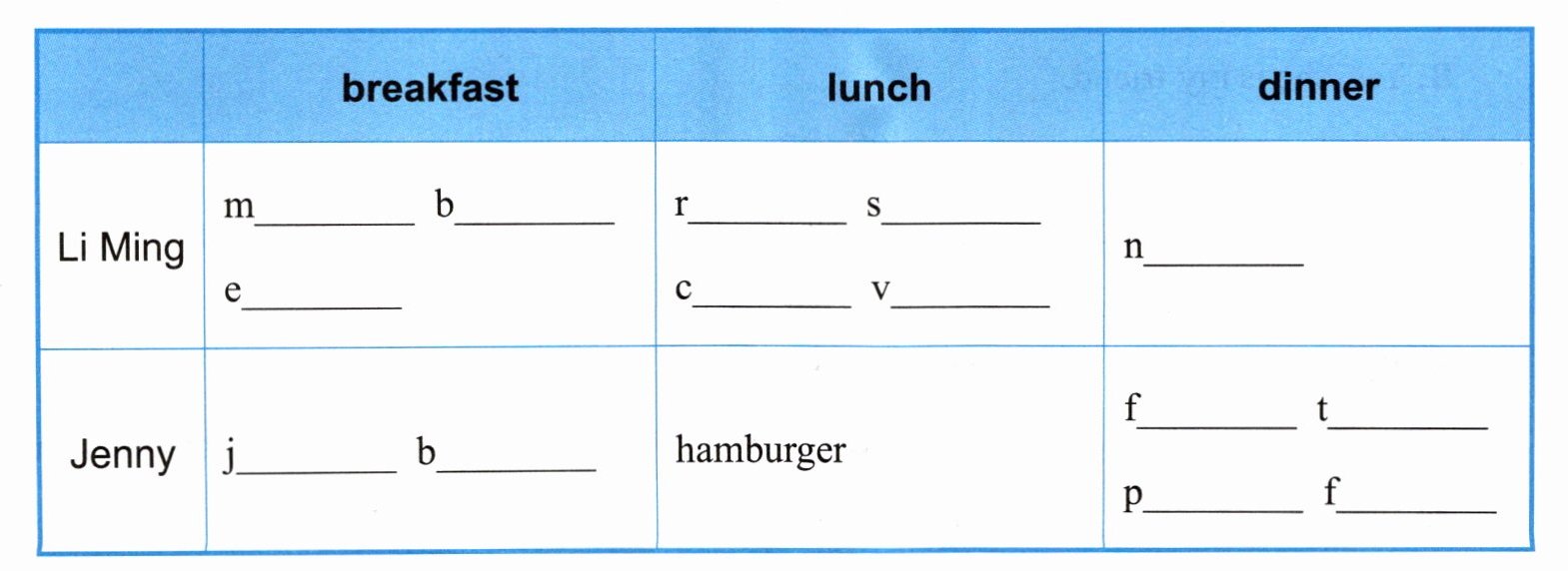 | Li Ming | milk, bread, eggs | rice, soup, chicken, vegetables | noodles |