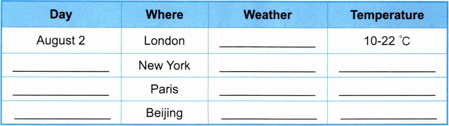 询问温度应该说:"What's the temperature?", 回答是 "____ degrees."。如果是零下多少度,可以说____________ degrees below zero。temperature 还有 "体温" 的意思。如:take a temperature 量体温,have a temperature 发烧。