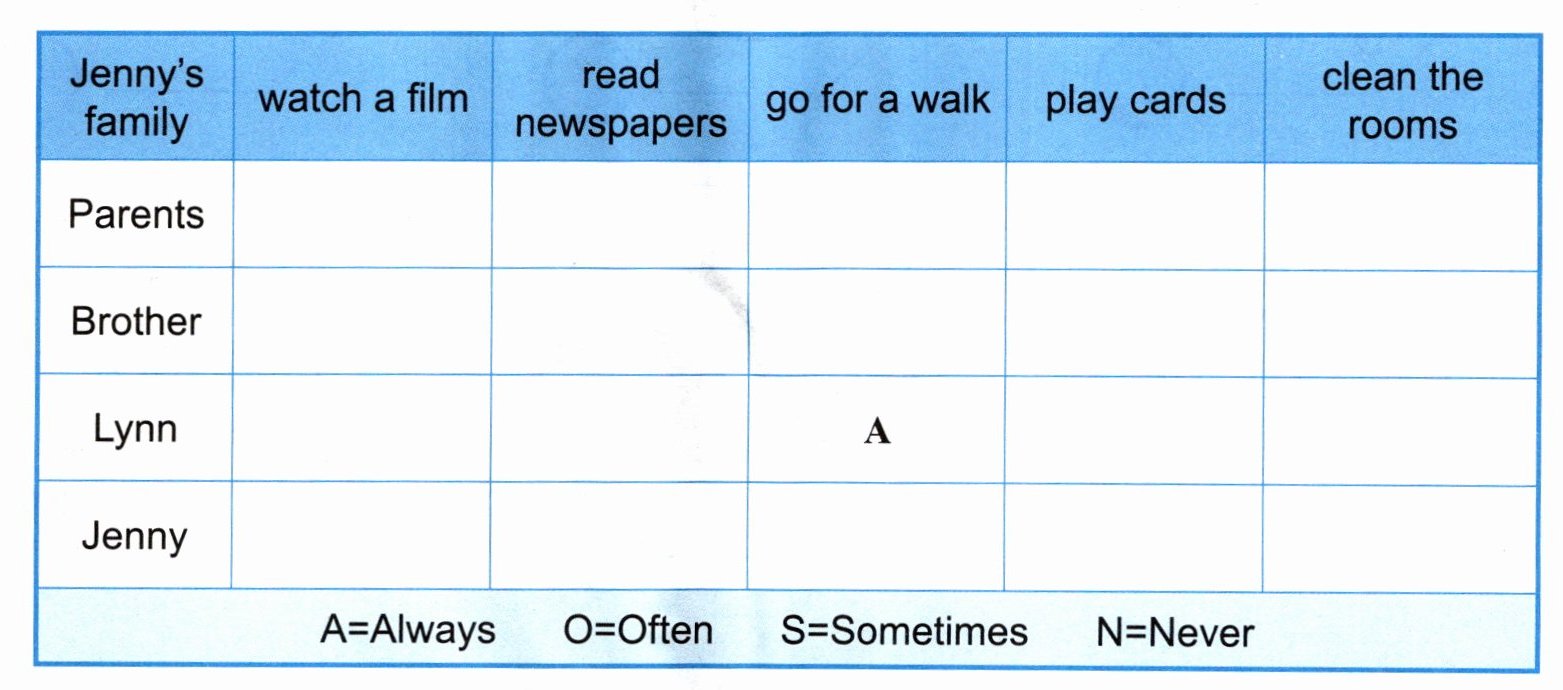 | Jenny's family | watch a film | read newspapers | go for a walk | play cards | clean the rooms |