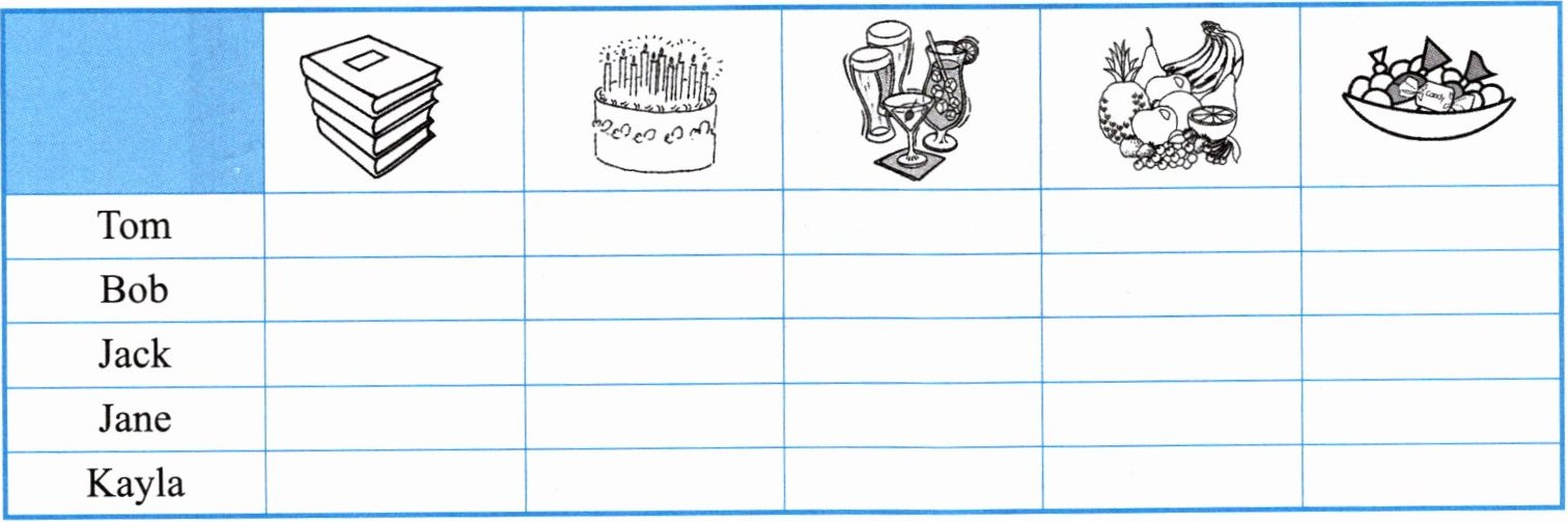 Tom's friends arrive at five o'clock. They give Tom some story books and say "Happy Birthday". Tom likes the gifts from his friends. They all like the birthday cake. Bob loves the candy and Jack loves the drinks. Jane and Kayla like the fruit. And they have fun together. They're very happy. It's a wonderful party.